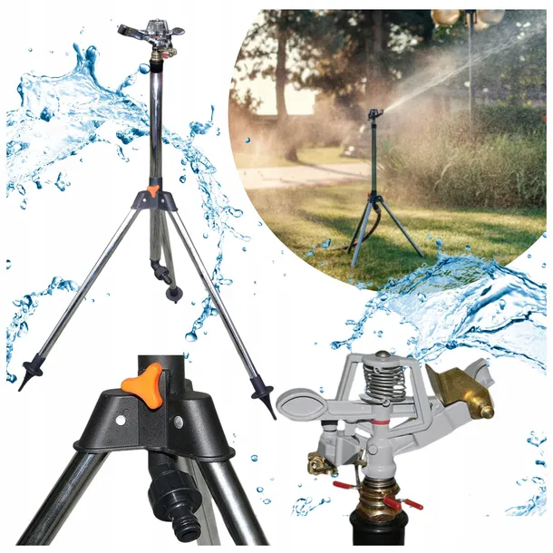 ? Profesjonalny metalowy zraszacz teleskopowy, pulsacyjny ze stalową głowicą zraszającą, zamontowany na statywie.